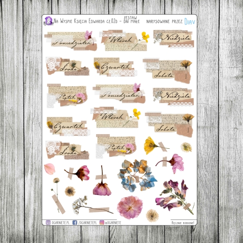 Część 2C to arkusz, na którym znajdują się małe dni tygodnia (jeśli wolisz duże sprawdź część 2A) oraz suszone kwiaty. Suszone kwiaty i liście, które znajdują się na arkuszach - nie są rysowane, to zeskanowane ususzone rośliny, które wplotłam w rysunkowy temat. :)