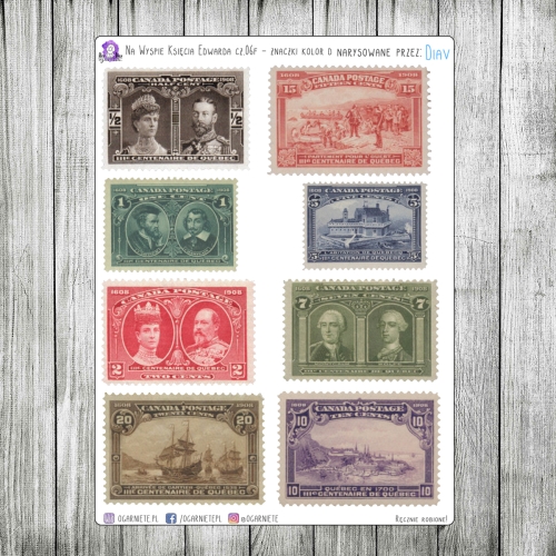 Szósta część zestawu posiada wiele "podczęści" ;). Szósty arkusz z serii 06 to arkusz zapełniony znaczkami pocztowymi. Znaczki te zostały wydane w Kanadzie w 1906 oraz 1908 roku. Na tym arkuszu znajdują się w one w oryginalnych kolorach, jeśli chcesz ich sepiowe wersje - sprawdź arkusz 06G. Jeśli zaś wolisz mniejsze znaczki - koniecznie zobacz arkusz 06e.
