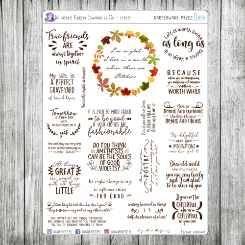 Zestaw "Na Wyspie Księcia Edwarda" silnie nawiązuje do twórczości Lucy Maud Montgomery. Na naklejkach dostrzec można cytaty z jej książek - głównie z Ani z Zielonego Wzgórza. Uważny obserwator z pewnością dostrzeże także inne elementy nawiązujące do tej opowieści :).