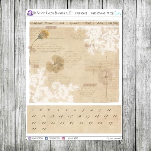 Siódma część zestawu to arkusz, na którym znajduje się miesięczny, uniwersalny kalendarz oraz numery dni. Kalendarz ten ma sześć linii, z czego ostatnia jest osobna - większość miesięcy zmieści się w pięciu liniach, ale raz na jakiś czas zdarzy się miesiąc, dla którego pięć to za mało i wymaga sześciu :).
