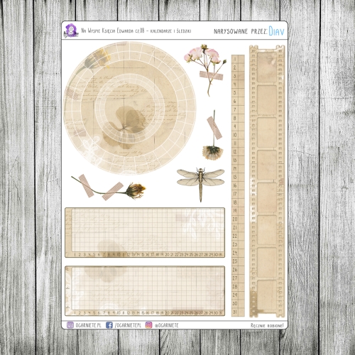 Ósma część zestawu to arkusz z kalendarzami i śledzikami. Znajdują się tu dwa miesięczne kalendarze kołowe, śledzik (tracker) nastroju (chociaż może posłużyć za śledzik czegokolwiek co może być zaznaczane przy pomocy wykresu), drugi śledzik wykresowy, miesięczna oś czasu oraz tracker filmów/seriali. Dodatkowo kilka naklejek ozdobnych.