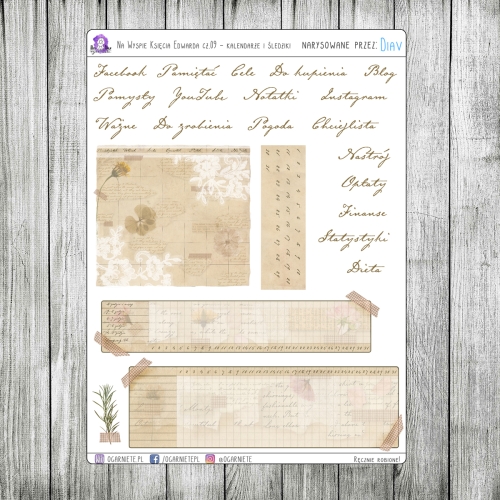 Dziewiąta część zestawu to również arkusz z kalendarzami i śledzikami. Znajduje się tu mini wersja kalendarza miesięcznego, uniwersalnego, bardzo miniaturowe numery dni (użyj pęsety do ich naklejania!), nagłówki do miesięcznej rozkładówki, habit tracker czyli śledzik nawyków, śledzik snu oraz roślinka :D.