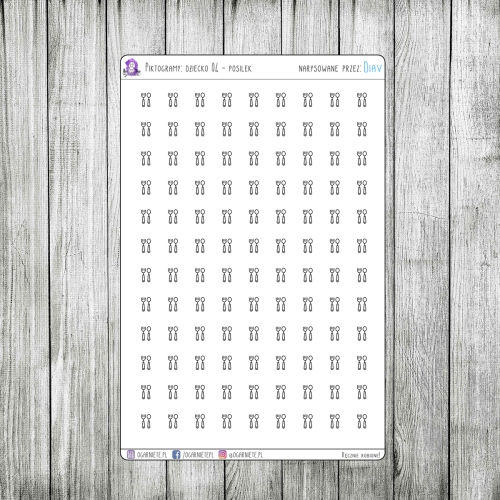 Arkusz, na którym znajdują się kropki funkcjonalne, dotyczące dzieci. Ikonki przedstawiają: sztućce, mające za zadanie sugerować posiłek. :) Można ich również użyć do oznaczania w plannerze posiłków dorosłych lub też do planowania posiłków.