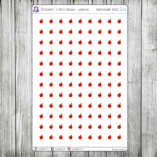 Arkusz, na którym znajdują się kropki funkcjonalne przedstawiające jabłka. Ich zadaniem jest oznaczenie zjedzonych porcji owoców. Jedna kropka oznacza jedną porcję.