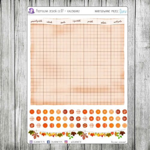 Kalendarz miesięczny, uniwersalny (z dodatkową linią). Do kompletu numery dni na wzorzystych kropkach, kilka pustych kropek oraz girlanda z liści. :)