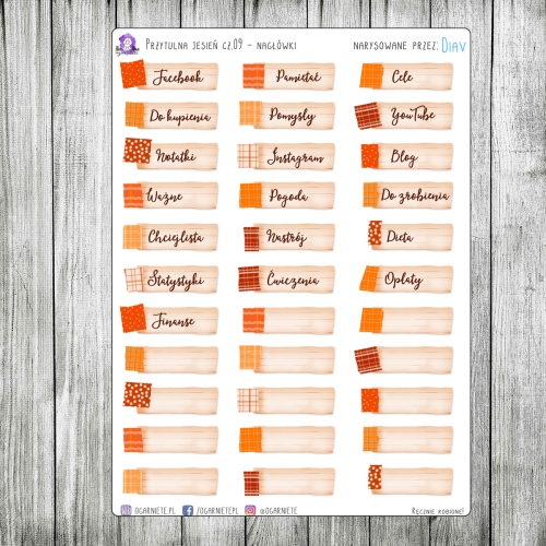 Dziewiąty arkusz zestawu Przytulna Jesień zapełniony jest aż po same brzegi nagłówkami w dwóch wersjach - wypełnionymi oraz pustymi. Idealne do miesięcznych rozkładówek, ale też nadają się do wykorzystania w tygodniówkach lub dniówkach.